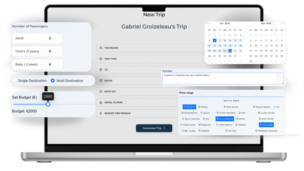 Un parcours simple et fluide pensé pour les agences de voyage. En trois étapes, créez, ajustez et finalisez des voyages sur-mesure pour vos clients.
